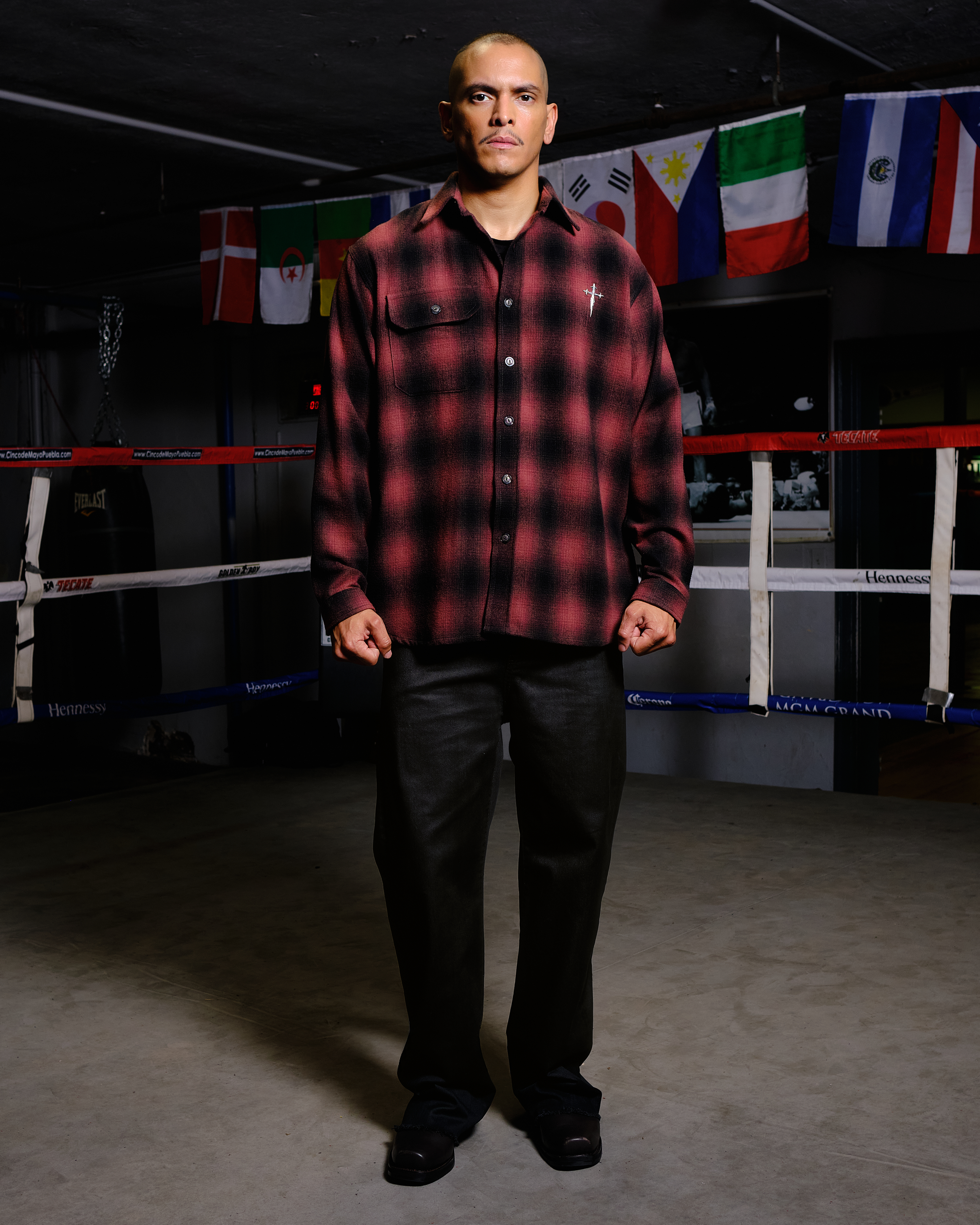 Long-sleeve button-up shirt cut from Japanese brushed wool flannel with a soft, textured hand. Features a red and black gradient plaid pattern, a single chest flap pocket, and a .925 sterling silver S(N)S cross. Designed with a curved hem and buttoned cuffs.